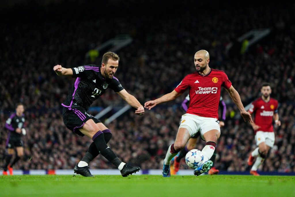 Precisando do resultado, o Manchester United começou o jogo pressionando o Bayern, mas a primeira chance foi dos Bávaros no chute de Harry Kane. O primeiro chute dos ingleses na meta aconteceu aos 22, no remate do Shaw que Neuer defendeu. O time inglês conseguiu criar perigo nas jogadas pelos corredores laterais, especialmente com Antony. O Bayern tinha Sané e Musiala prontos para as jogadas de transição.