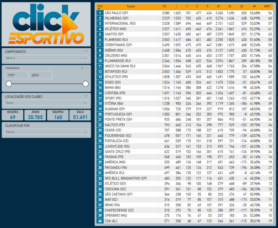 Com o término da temporada 2023, o Click Esportivo atualiza o ranking histórico de pontos no Campeonato Brasileiro Unificado e seus diversos recortes temporais, regionais e por divisão.