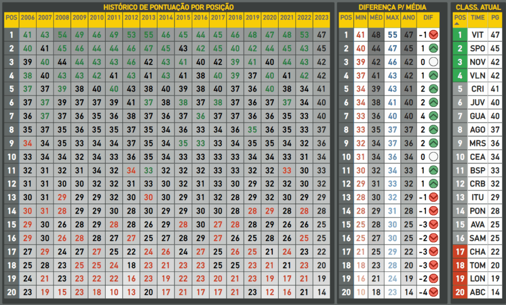 Exemplos de reações semelhantes não faltam. Desde 2006, 10 equipes conseguiram subir mesmo marcando 37 pontos ou menos na 24ª rodada. A grande diferença está justamente na alta pontuação das equipes de cima em 2023.