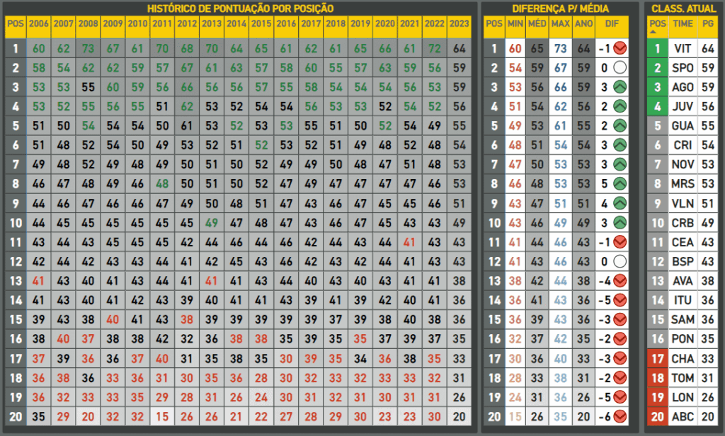 O quadro acima comprara a classificação atual da Série B do Brasileirão com a pontuação das equipes em edições anteriores dos pontos corridos. Apesar dos tropeços de boa parte das equipes da parte de cima da tabela, a pontuação na briga do acesso segue acima da média e com um número maior de postulantes ao G-4. Na briga contra a degola, a projeção de pontuação de corte segue abaixo da média histórica da competição.