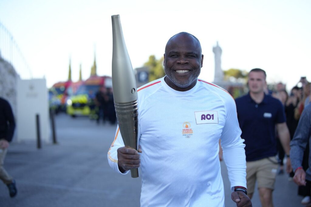 Basile Boli com a tocha olímpica. Foto: Reprodução/Paris-2024