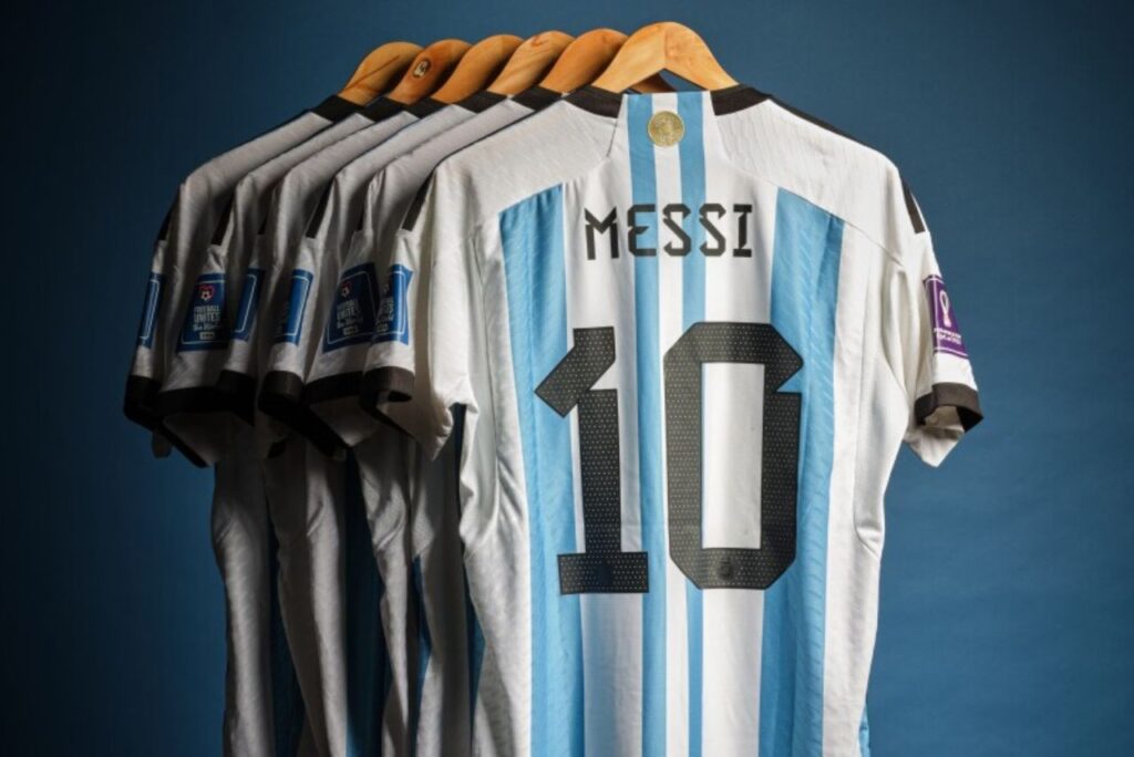 Um lote com seis camisas usadas por Lionel Messi na campanha do título da Argentina na Copa do Mundo de 2022, uma delas na final contra a França, foi arrematado por US$ 7,8 milhões (R$ 38,1 milhões na cotação atual), anunciou a casa de leilões Sotheby’s nesta quinta-feira (14).