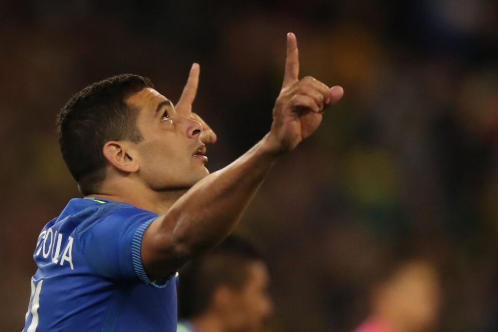 Diego Souza comemora gol pela Seleção. Foto: Lucas Figueiredo/CBF
