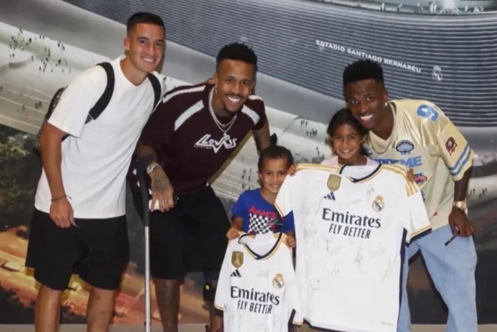 Criança vitima de torcedor do Atlético de Madrid foi presenteada por atletas do Real. Foto: Reprodução/RMFC