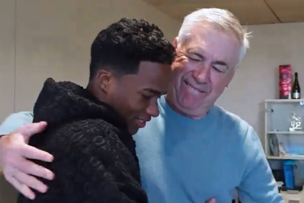 Endrick durante encontro com o técnico Carlo Ancelotti neste sábado. Foto: Reprodução/X