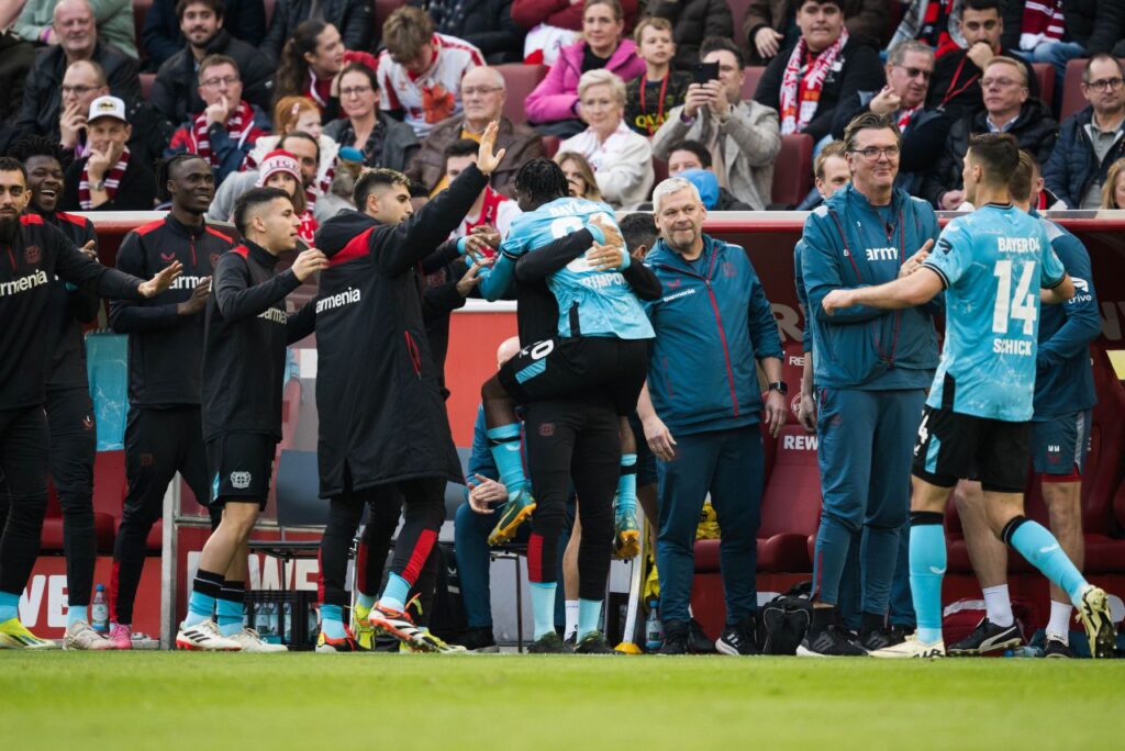 Aproveitando a superioridade numérica após o Colônia perder o atacante Jan Thielmann expulso (15′), o time do técnico Xabi Alonso abriu o placar no primeiro tempo marcando com o meia holandês Jeremie Frimpong (37′).