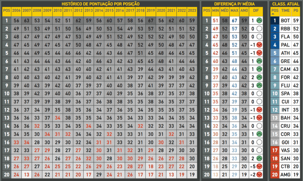 Nas edições anteriores do Brasileirão, a média final de pontuação do primeiro time fora da zona de rebaixamento foi de cerca de 43 pontos, oscilando entre 39 (2019) e 46 (2009 e 2021). Já o primeiro time dentro da zona terminou com 41 pontos, em média, com piso de 36 (2019) e teto de 45 (2009).