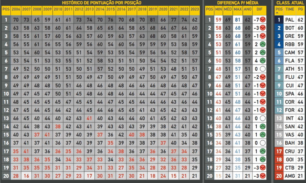 Embora os jogos atrasados tenham grande impacto nessa análise, a tabela segue mostrando pontuações acima da média entre as equipes que ocupam da 4ª até a 6ª posição, bem como entre as equipes da luta contra a degola, em menor proporção.