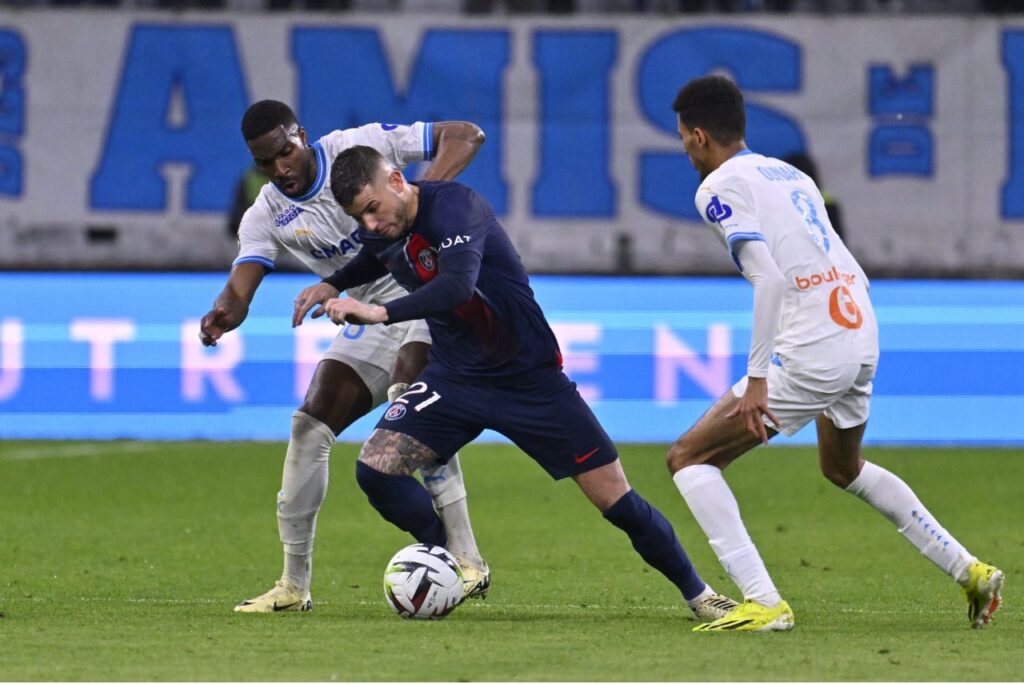 Apesar de ter ficado com dez jogadores em campo desde o final do primeiro tempo com a expulsão do zagueiro brasileiro Lucas Beraldo, o Paris Saint-Germain (PSG) venceu o Olympique de Marselha por 2 a 0 neste domingo (31), no estádio Vélodrome, no jogo que fechou a 27ª rodada do Campeonato Francês.