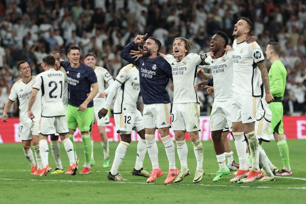 Jogadores do Real Madrid comemoram grande vitória. Foto: Thomas Coex / AFP
