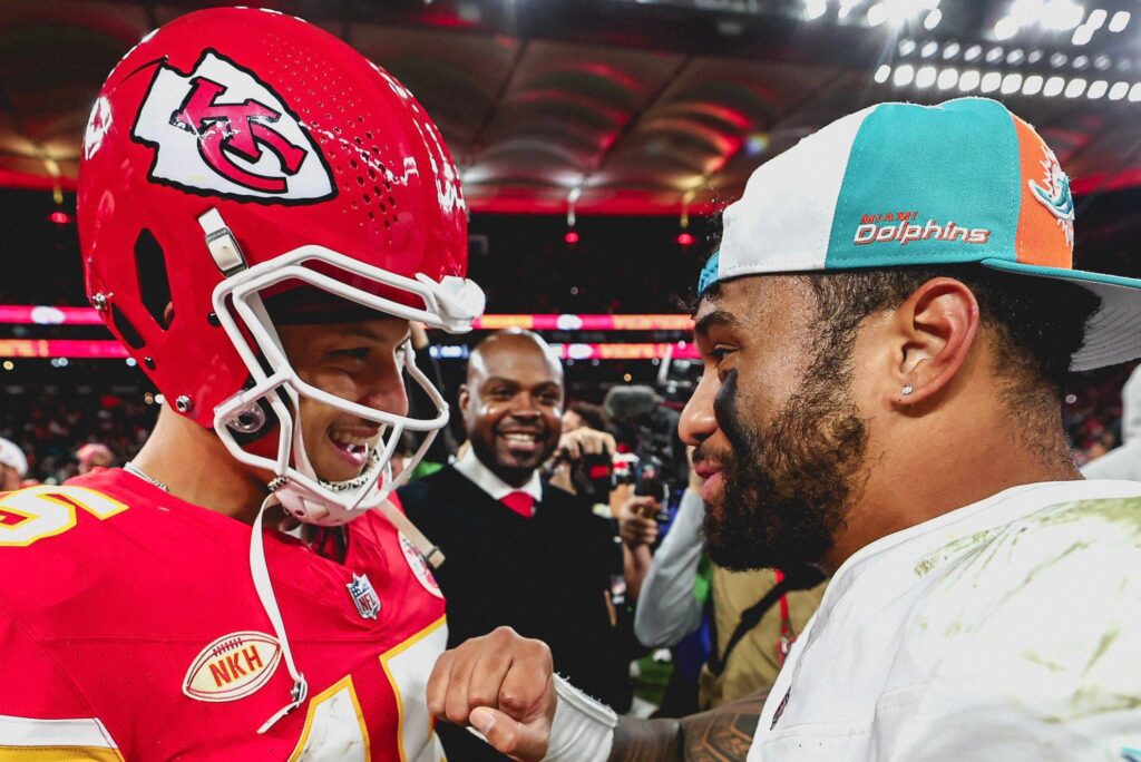 Os quarterbacks, Patrick Mahomes e Tua Tagovailoa depois da partida. Foto: Reprodução/Twitter