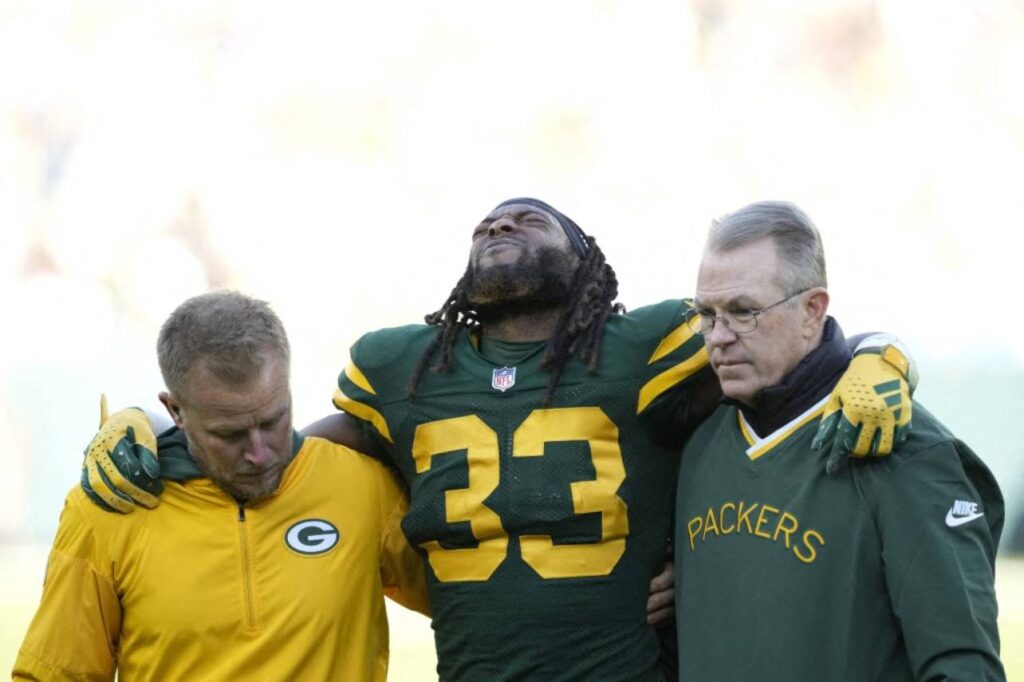 Aaron Jones desfalcou os Packers nos últimos três jogos por conta de uma entorse no ligamento colateral medial, mas o jogador fez algumas movimentações ao longo da semana e tem chances de ser acionado durante a partida.