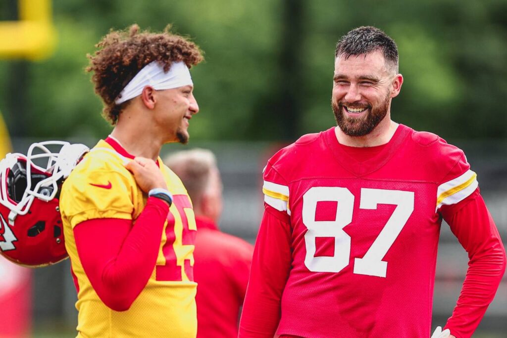 Travis Kelce e Mahomes durante treino do Kansas. Foto: Reprodução/X