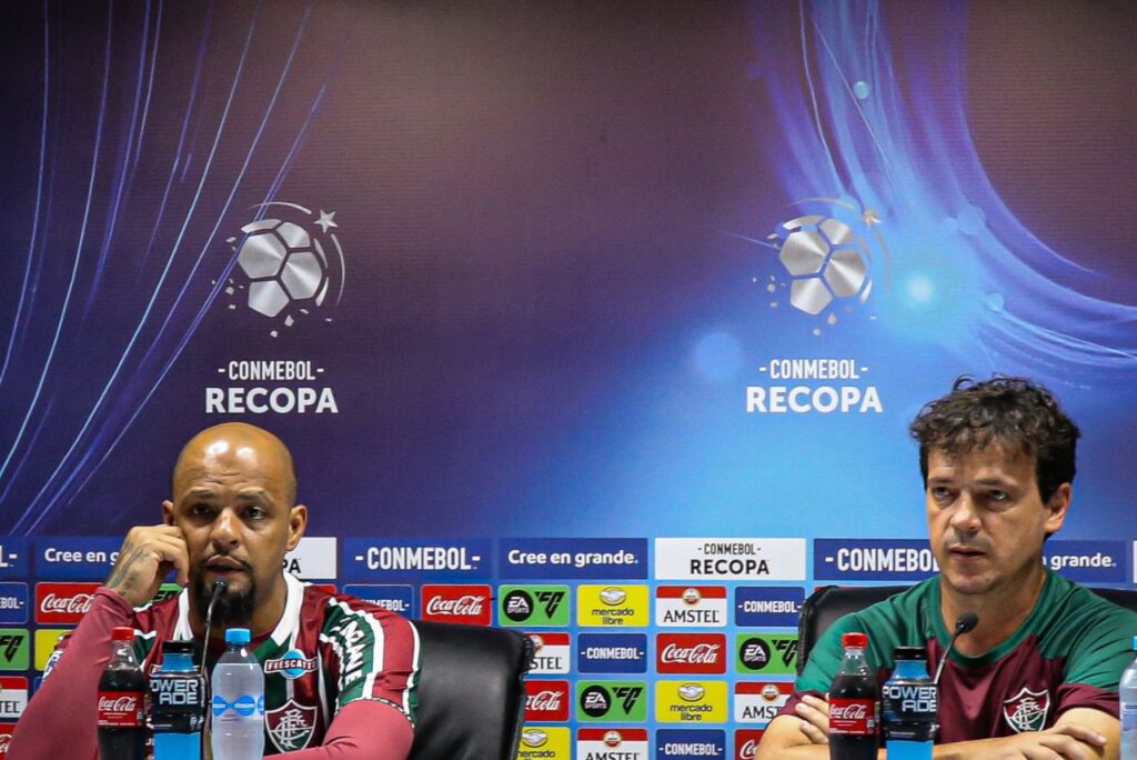 Felipe Melo ao lado de Fernando Diniz na coletiva do Fluminense