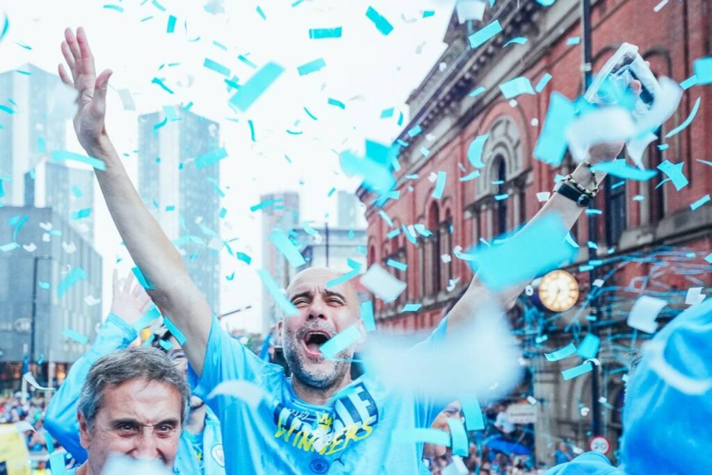 Pep Guardiola durante a comemoração do título inglês. Foto: Reprodução/X